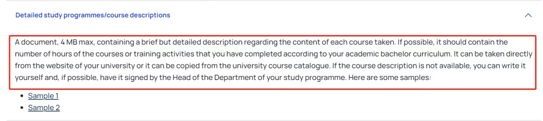 • 课程描述(重要!),*大不超过 4 MB,包含关于所学每门课程内容的简短而详细的描述。需要包含课程完成的课程或培训活动的小时数,并由学习计划部门负责人签名。