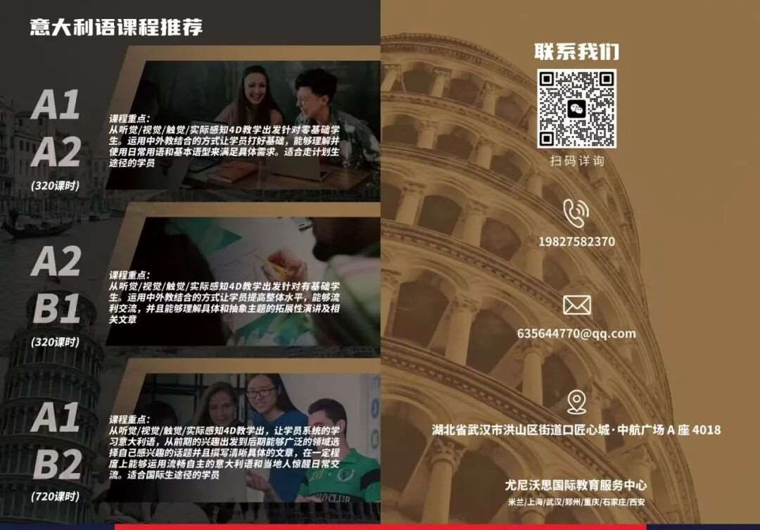 针对零基础意大利水平的学生会中文的意大利外教带领学生轻松入门意大利语,学完达到欧标A1等级,能够理解并使用日常用语和基本句型来满足具体的需求,能够进行自我介绍或介绍他人,能够提问并回答,如个人信息、亲属关系、住所、籍贯、朋友,问候问路购物等,能够在提问人语速较慢的情况下加入对话。