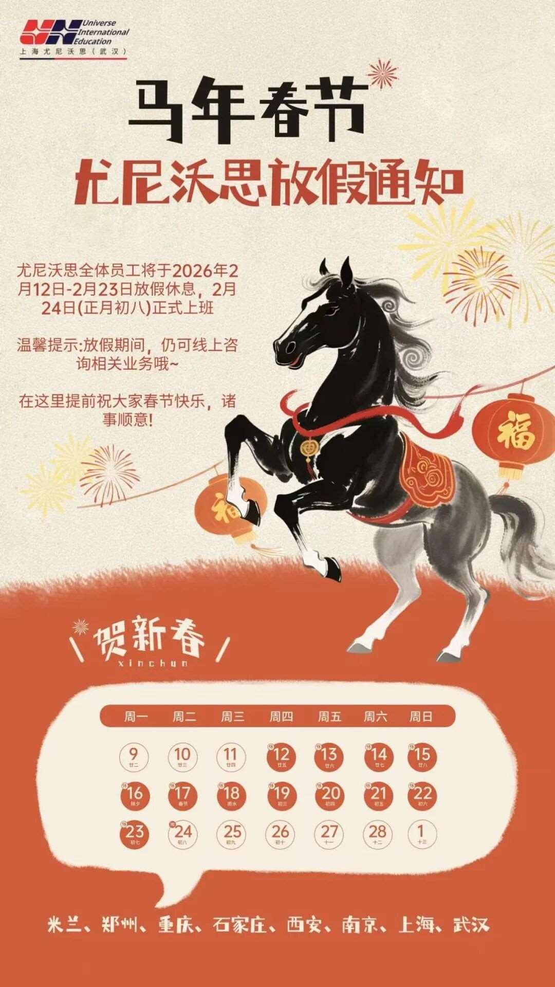 新春将至,岁序更新。为欢度佳节,尤尼沃思国际教育将 2026 年春节假期事宜公告如下: